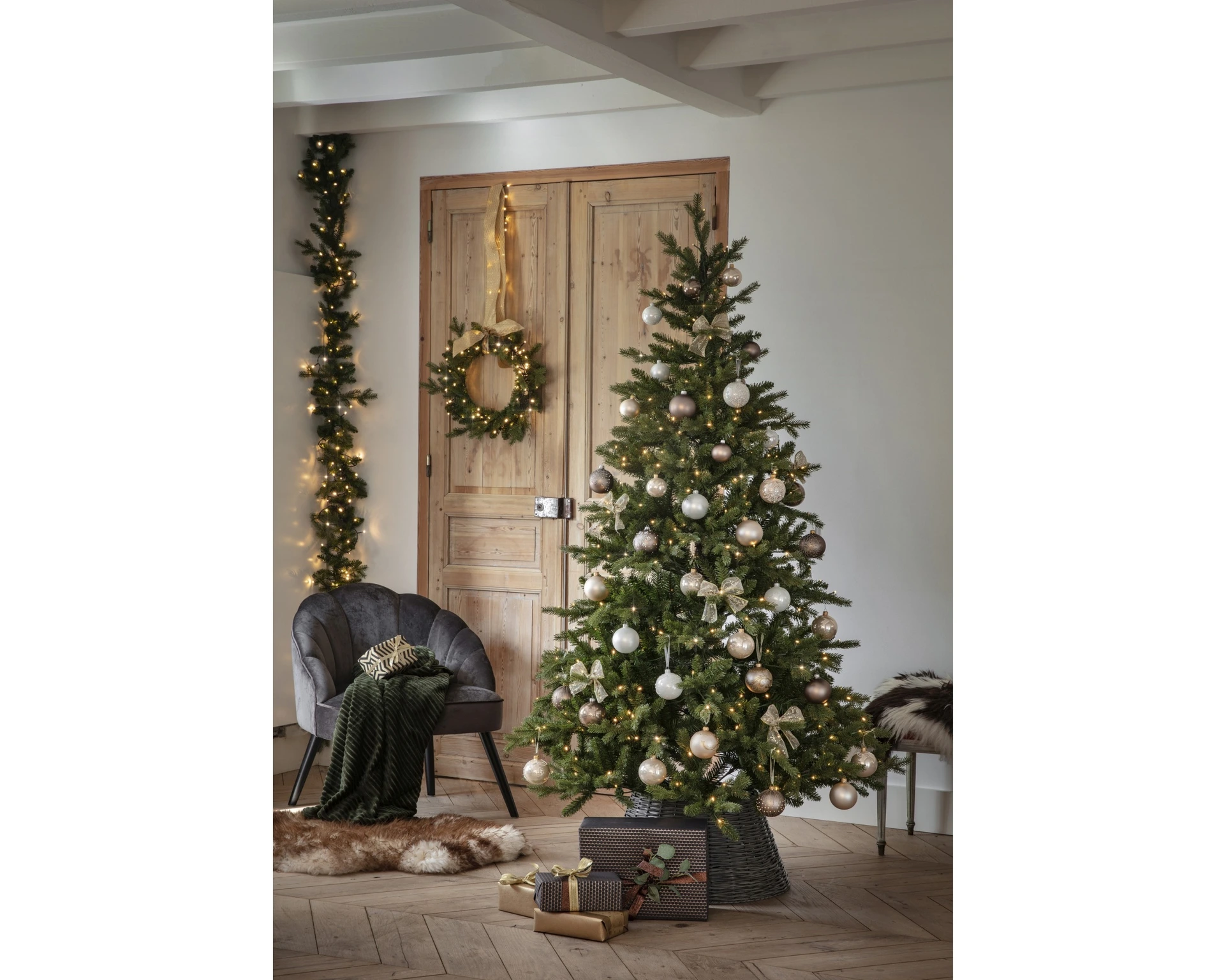 Kunstkerstboom Allison Pine heeft 112 takken en totaal 4546 tips, waarvan 2221 PVC tips en 2325 tips van PE. De naalden zijn zacht en zien er heel echt uit. D.m.v. een scharnier hang je de takken op. De boom is inclusief een metalen voet die een diameter van 90 cm heeft. De boom heeft vier secties.