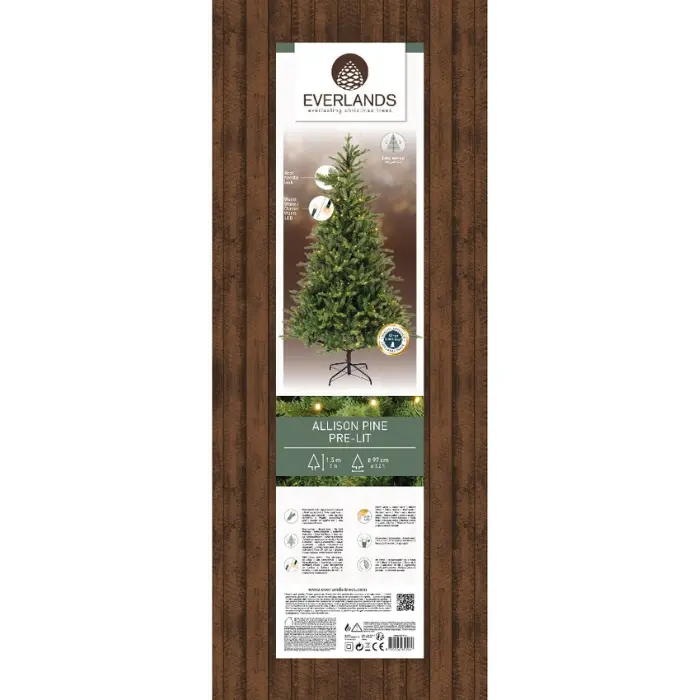 De Allison kunstkerstboom heeft 220 LED lampjes met een warm witte klassieke kleur. De afstand tussen de lampjes is 23 cm en de lampjes hebben een grote van 5 mm. Er zit en een timer op en heeft 8 functies. Het aanloopsnoer is 5 m. De boom is te gebruiken voor binnenshuis. Kunstkerstboom Allison Pine heeft 24 takken en totaal 826 tips, waarvan 361 PVC tips en 465 tips van PE. De naalden zijn zacht en zien er heel echt uit. D.m.v. een scharnier hang je de takken op. De boom is inclusief een metalen voet die een diameter van 40 cm heeft. De boom heeft twee secties.
