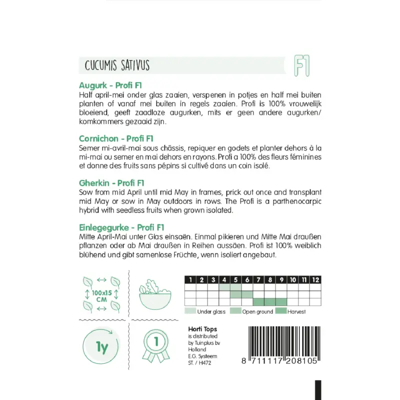 Augurken 'Profi F1' zaden zaai je vanaf half april - mei onder glas, dan verspenen in potjes en half mei buiten planten. Of vanaf mei buiten in regels zaaien. Plantafstand is 100 x 15 cm. Profi is 100% vrouwelijk bloeiend en geeft zaadloze augurken, mits er geen andere augurken/komkommers gezaaid zijn. Verder is HT Augurken 'Profi F1' ongevoelig voor komkommervirus. Er zitten ca. 40 graden per gram in een zakje.