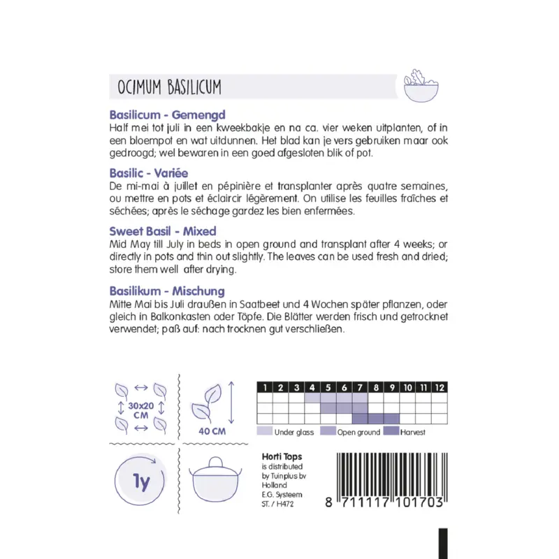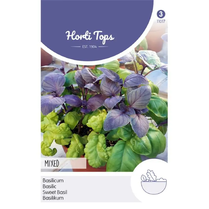Basilicum zaden kun je zaaien van half mei - juli in een kweekbakje en na ca. vier weken uitplanten. Of in een bloempot zaaien en wat uitdunnen. Zaai op een zonnige maar beschutte plek. De plantafstand is 30 x 20 cm. Het blad kun je vers gebruiken of gedroogd. Dan wel goed in een afgesloten blik of pot bewaren. Het is een kleurrijk en smakelijk mengsel die ook geschikt is om in een pot te kweken. Er zitten ca. 600 zaden per gram in een zakje.