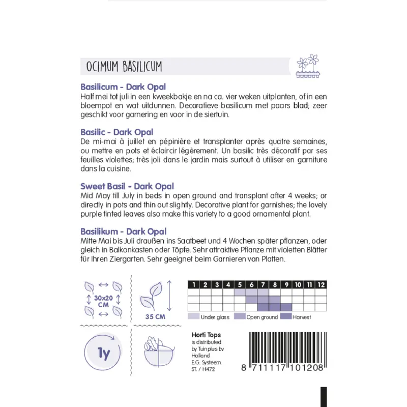 Basilicum rode 'Dark Opal' zaden kun je zaaien van half mei - juli in een kweekbakje en na ca. vier weken uitplanten. Of in potten op een warme plek en dan wat uitdunnen. De plantafstand is 30 x 20 cm. Het is een decoratieve basilicum met paars blad. Je kunt de onderste blaadjes en de jonge topjes oogsten. Er zitten ca. 600 zaden per gram in een zakje.