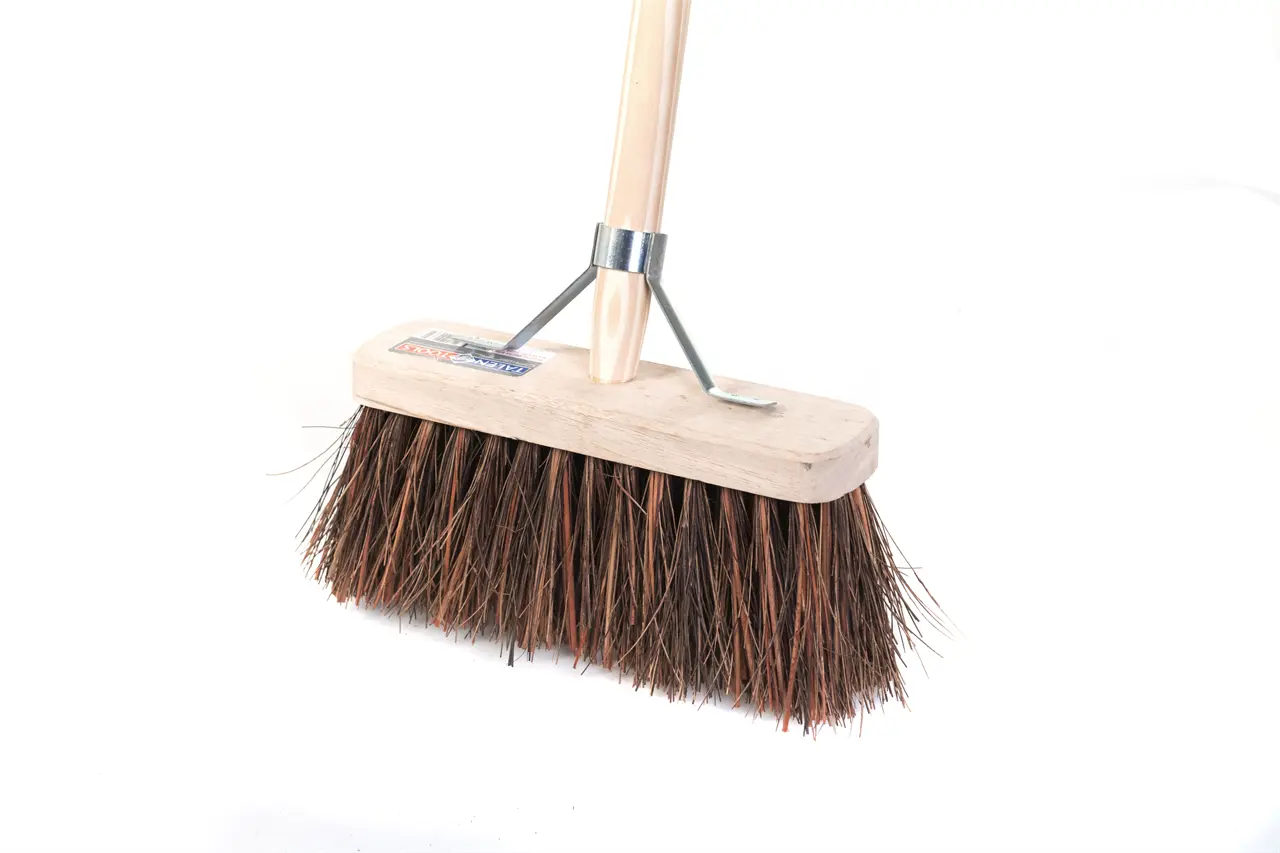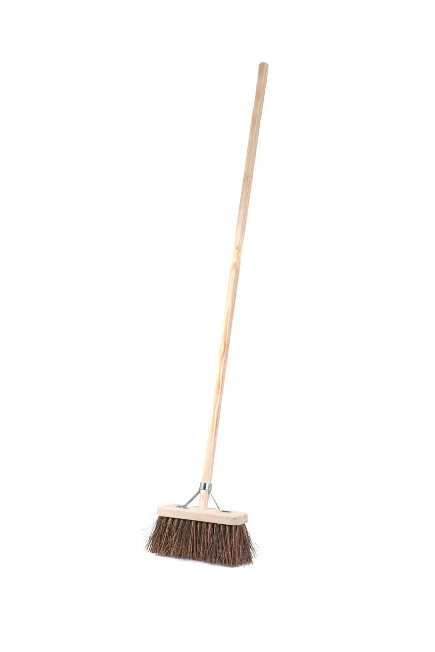De Bezem van Talen Tools is geschikt voor ruwe oppervlaktes. De breedte van de bezem is ca. 30 cm en zo kun je grote gedeelten en smalle paadjes gemakkelijk schoon vegen. De natuurvezel haren zijn meer dan 10 cm lang waardoor je ook in spleten en kieren kunt vegen. Omdat de haren verschillende diktes hebben, kun je de bezem ook inzetten als borstel, vooral op ruwe oppervlaktes. Omdat er een verstevigingsbeugel is gebruikt, blijft de houten steel goed vastzitten. Zo kun je nog even wat meer kracht zetten. Het natuurvezel is bestand tegen nattigheid, dus de haren klitten niet snel samen. Ruim je na het vegen de bezem weer op, doe dit dan met de borstelharen omhoog. Zo trekken de haren niet snel krom.