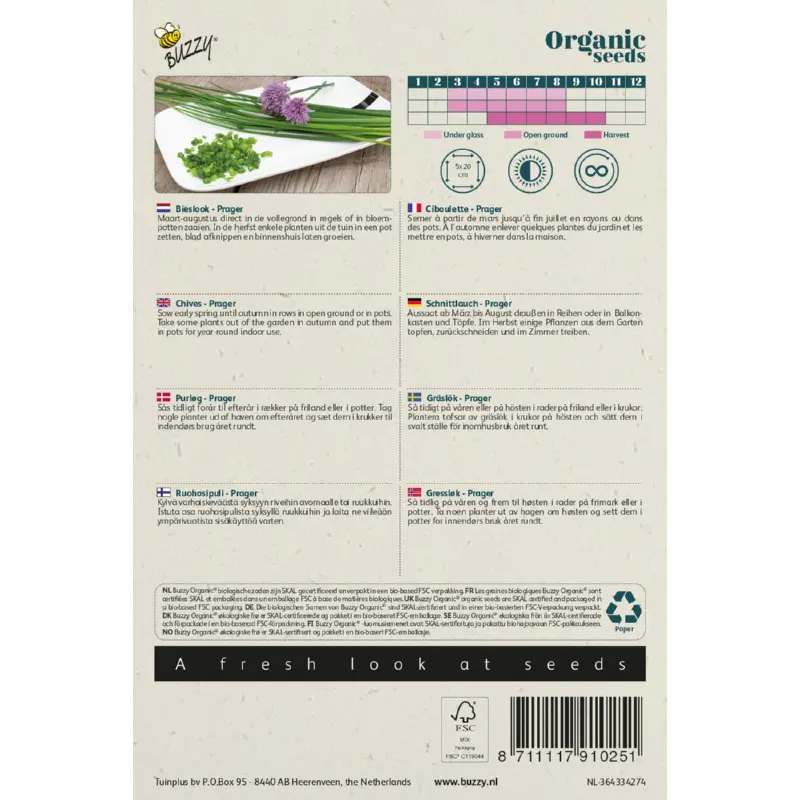 Bieslook 'Prager' bio zaden kun je zaaien van maart - augustus direct buiten in regels of in bloempotten. Groeit goed op alle grondsoorten en je kunt meerdere malen oogsten. De plantafstand is 20 x 5 cm. In de herfst kun je enkele planten uit de tuin in een bloempot zetten, het blad afknippen en dan binnenshuis verder laten groeien. Er zitten ca. 800 zaden per gram in een zakje.