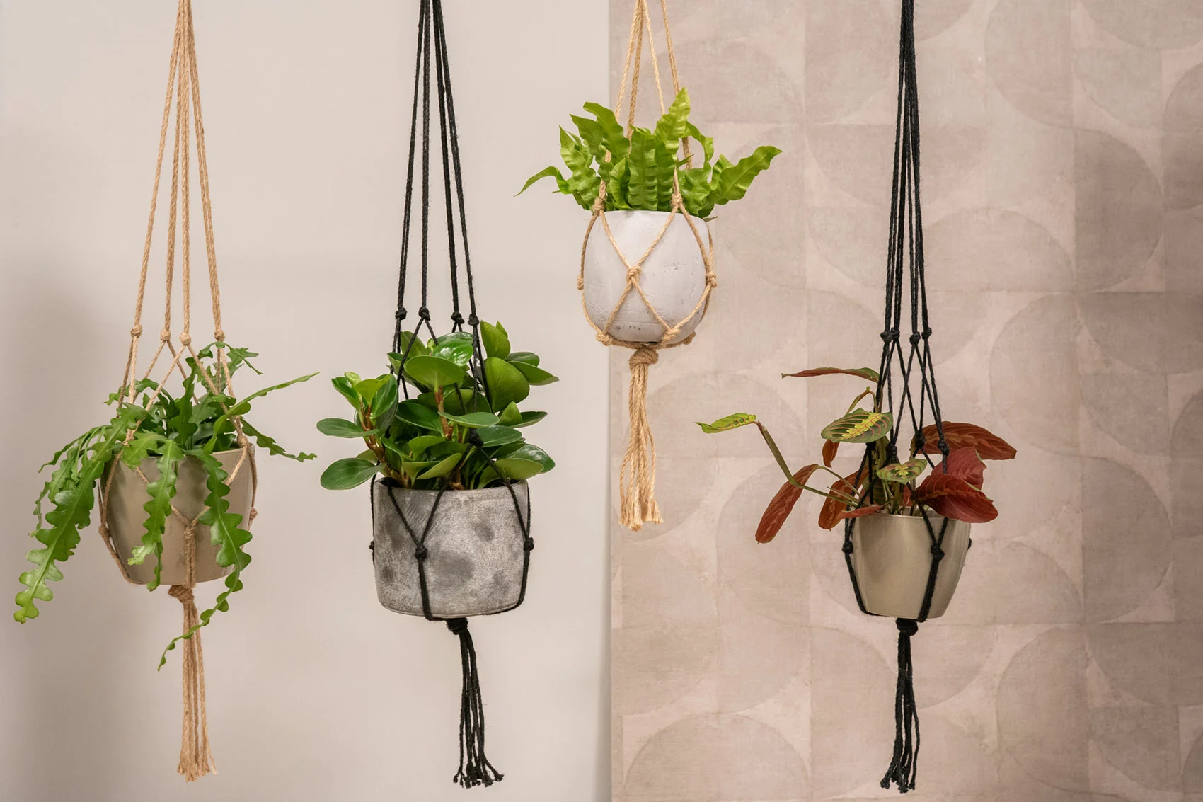 Bloempothangers van Macramé zijn weer helemaal in. Vooral met je mooiste hangplanten er in.Tuinland Assen (10)