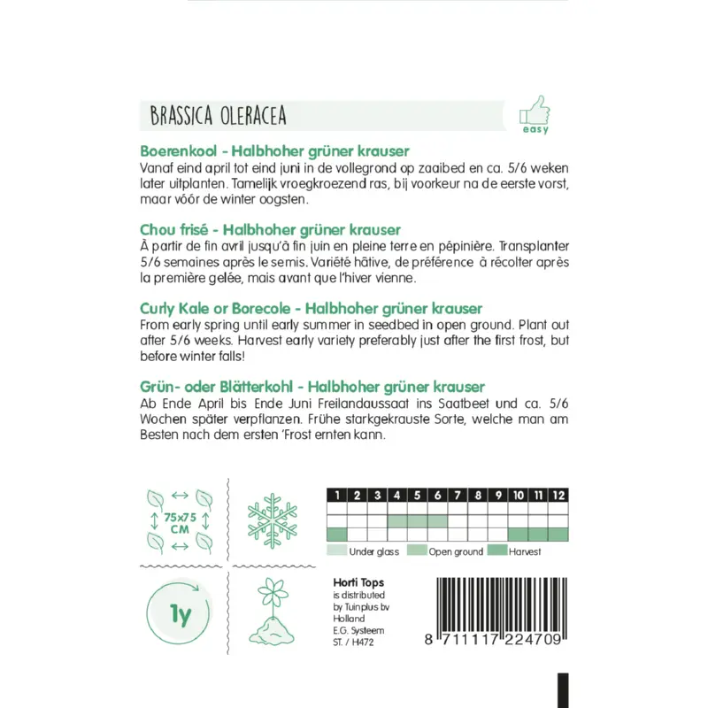 HT Boerenkool middelhoge fijne krul zaden zaai je vanaf eind april tot eind juni in de vollegrond op een zaaibed. Ca. 5/6 weken later uitplanten. Houd de grond voldoende vochtig. Plantafstand is 75 x 75 cm. Er zitten ca. 300 graden per gram in een zakje. Het is een tamelijk vroegkroezend ras die je het beste na de eerste vorst, maar wel vóór de winter moet oogsten. HT Boerenkool middelhoge is een snel groeiend en zeer productief ras.