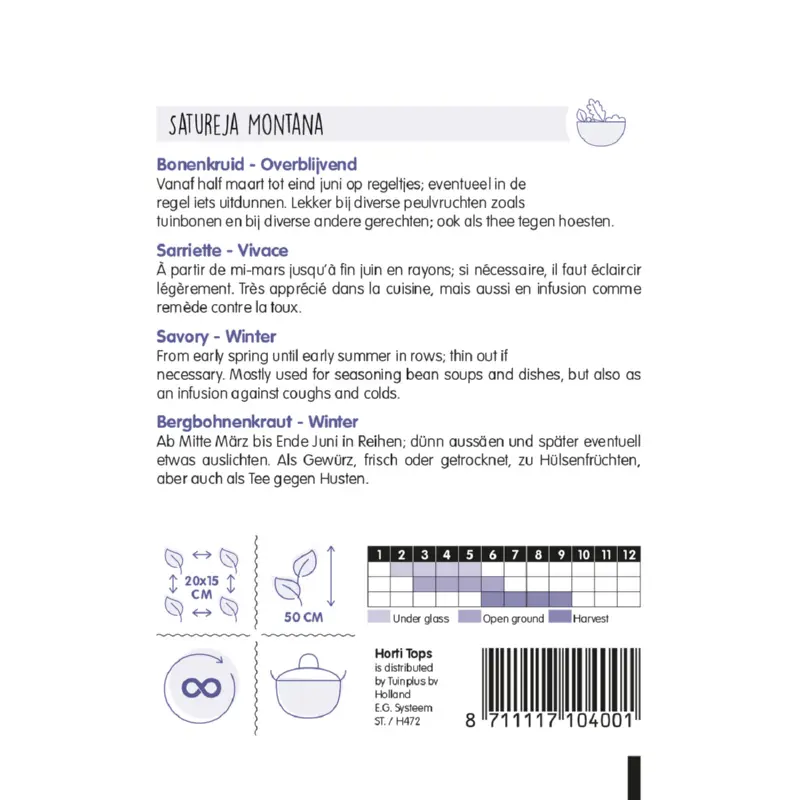 Bonenkruid - Overblijvende zaden kun je zaaien van half maart tot eind juni op regeltjes. Eventueel in de regel iets uitdunnen. Je kunt ook in potten zaaien. Houd de grond voldoende vochtig. Bonenkruid is lekker bij diverse peulvruchten zoals tuinbonen en bij diverse andere gerechten. Je kunt er ook thee van zetten tegen het hoesten. Oogst de jonge blaadjes en topjes. De plantafstand is 20 x 15 cm. Er zitten ca. 2800 zaden per gram in een zakje.