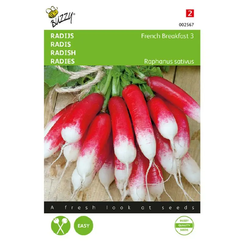 Buzzy® Organic zaden zaai je vanaf half maart - begin augustus direct op de juiste plek in de volle grond in regels. Iets uitdunnen. Plantafstand is 5 x 20 cm. Er zitten ca. 120 zaden per gram in een zakje. Zaai voor een goed biologisch evenwicht wortel en/of sla naast de radijsjes.