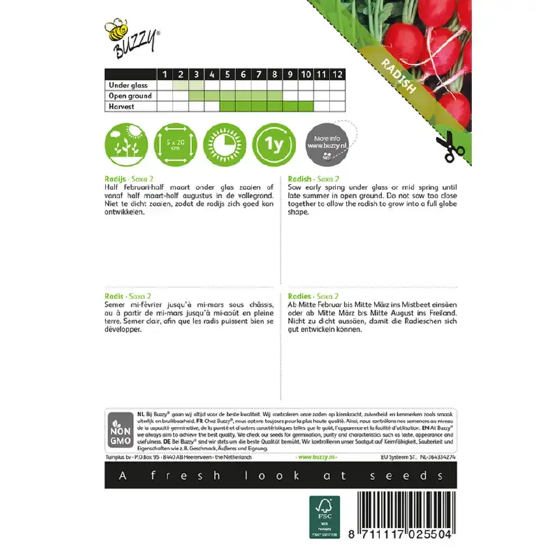 Buzzy® Radijs 'Saxa 2' zaden zaai je vanaf half februari - half maart onder glas. Of van half maart tot half augustus in de vollegrond. Niet te dicht zaaien zodat de radijsjes zich goed kunnen ontwikkelen. Plantafstand is 5 x 20 cm. Zaai je om de 14 dagen, dan kun je de hele zomer oogsten. Er zitten ca. 120 zaden per gram in een zakje.