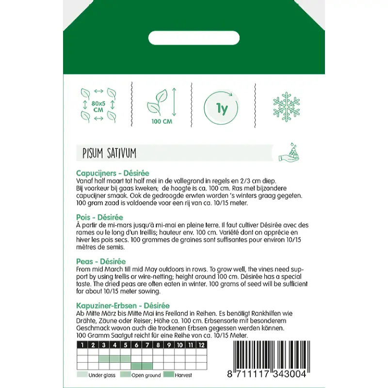 Capucijners 'Désirée' zaden zaai je vanaf half maart tot half mei in de vollegrond in regels en ongeveer 2/3 cm diep. Bij voorkeur bij gaas kweken, de hoogte is ca. 100 cm. Houd de grond voldoende vochtig. Plantafstand is 80 x 5 cm. Er zitten ca. 4 zaden per gram in een doosje. 100 gram zaad is voldoende voor een rij van ca. 10/15 meter. Heeft weinig last van nachtvorst. Kan zowel vers als gedroogd geoogst worden.