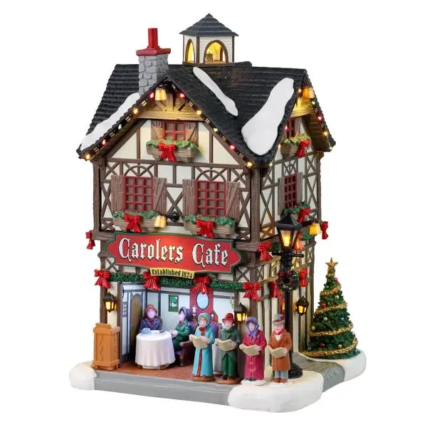 Het Carolers Cafe van Lemax is de plek om een lekker kopje koffie of thee te drinken. En als dan ook nog een koortje kerstliederen komt zingen is het plaatje compleet. Rondom het café is kerstversiering aangebracht. En de kerstverlichting zorgt voor nog meer sfeer. Werkt op 3x AA batterijen (niet inbegrepen) maar kan op een adapter (niet inbegrepen) worden aangesloten. Met aan/uit-schakelaar.
