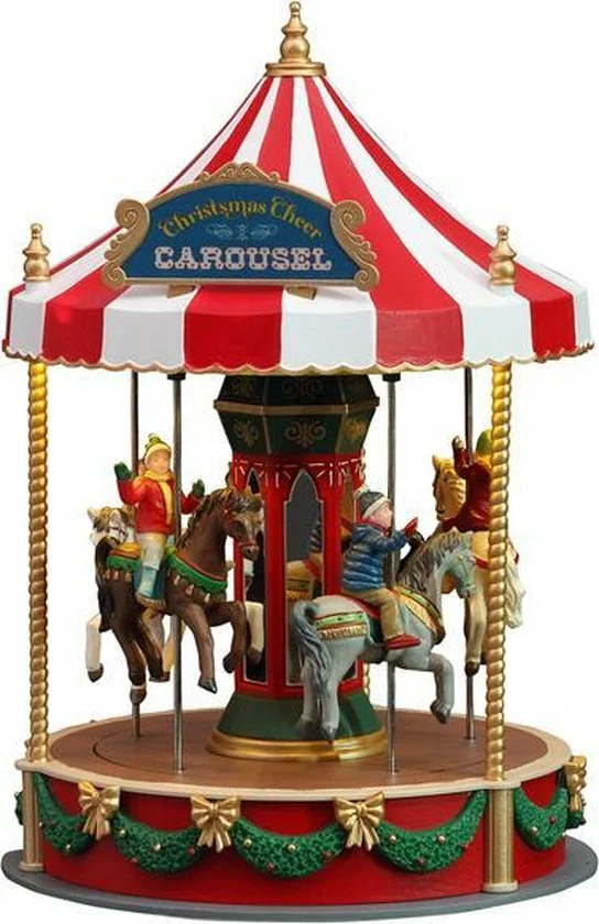 Een rood/wit gestreept dak boven vijf paarden waar kinderen op zitten. De Christmas Cheer Carousel draait zijn rondjes en de kinderen hebben grote pret. Met kerstversieringen en sfeervolle verlichting is dit een prachtige carousel voor je Lemax kerstdorp. Werkt op 3x AA-batterijen (exclusief), heeft een volumeregeling en een aan/uit-schakelaar.