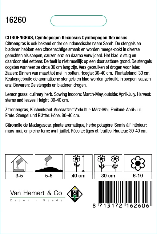 Zaai de zaden van Citroengras binnen van maart tot mei in potten voor. De zaden druk je heel voorzichtig in de grond en bedek ze met een dun laagje grond. Citroengras is een lichtkiemer. Buiten zaaien kan vanaf half mei tot juli zodra er geen nachtvorst meer is. De zaailingen dun je voorzichtig uit zodra ze groot genoeg zijn op 30 cm.