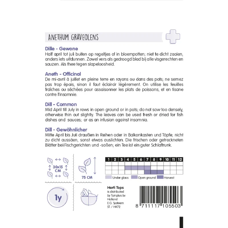 Dille 'Common' zaden kun je zaaien van half april tot juli buiten op regeltjes of in bloempotten. Ga niet te dicht zaaien of anders uitdunnen. Zaai op een zonnig plekje en houd de grond voldoende vochtig. Ook kun je in een bloempot zaaien. De plantafstand is 30 x 15 cm. De ranke planten bloeien met prachtige gele bloemenschermen. Maar is ook als thee tegen slapeloosheid te gebruiken.