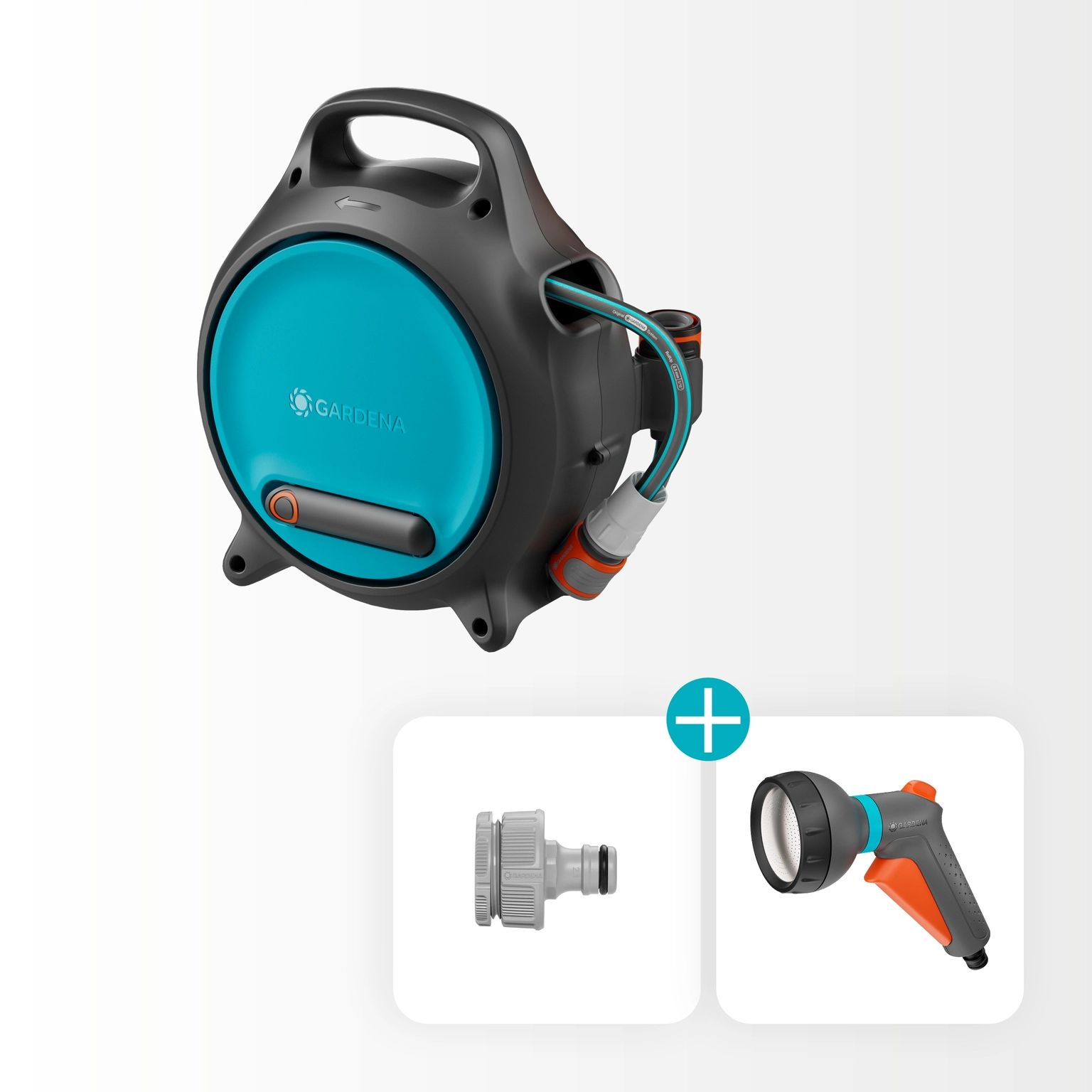 Bevat: 1x draagbare slangenbox Move, 1x Classic broes, 1x kraanstuk met adapter, 1x apparaathouder.