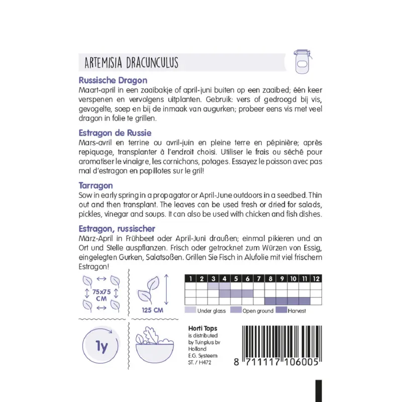 Dragon zaden kun je zaaien van maart - april in een zaaibakje of van april - juni buiten op een zaaibed. Eén keer verspenen en vervolgens uitplanten. De plantafstand is 75 x 75 cm. Het blad kan zowel vers als gedroogd worden gebruikt. En gebruik het eens bij de inmaak van augurken. Of vis grillen in folie met veel dragon. Er zitten ca. 6000 zaden per gram in een zakje.