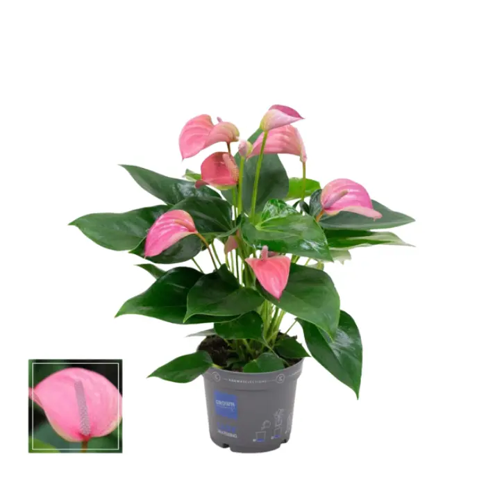DeJoli Pink' Anthurium (Flamingoplant) is een populaire bloeiende kamerplant met prachtige roze bloemen.