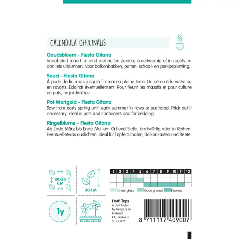 De Calendula (Goudsbloem) 'Fiesta Gitana' zaden kun je direct buiten op de plaats van bestemming zaaien vanaf eind maart tot eind mei. Breedwerpig of in regels en dan iets uitdunnen. Goudsbloemen staan heel mooi in randen, borders en perken. Plantafstand is 20 x 20 cm. Er zitten ca. 140 zaden per gram in een zakje.