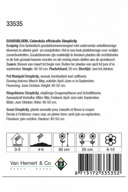 De Calendula (Goudsbloem) 'Simplicity' zaden kun je binnen voorzaaien van maart tot begin mei. Of buiten in april tot juni en september. Plantafstand is 20 cm. Het is een gemakkelijk te kweken bloem en stelt weinig eisen aan de grondsoort. Zaai op een zonnig plek of in half schaduw.