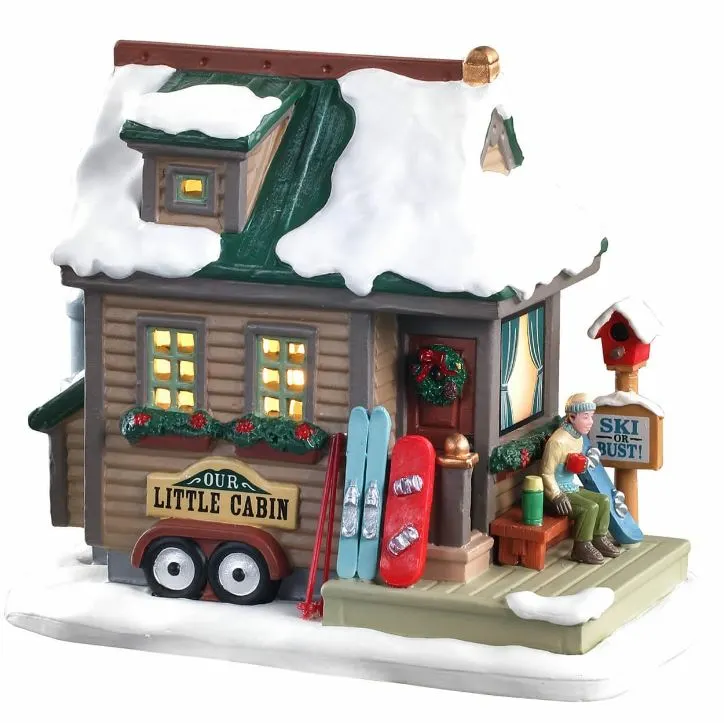 Home Away from Home van Lemax is een huisje op wielen. Sneeuw op het dak en skies/snowboards naast de deur, klaar om te skiën. Maar eerst nog even op het bankje voor het huisje warme chocomel drinken. Met 1,83 m lichtsnoer en een aan/uit-schakelaar.