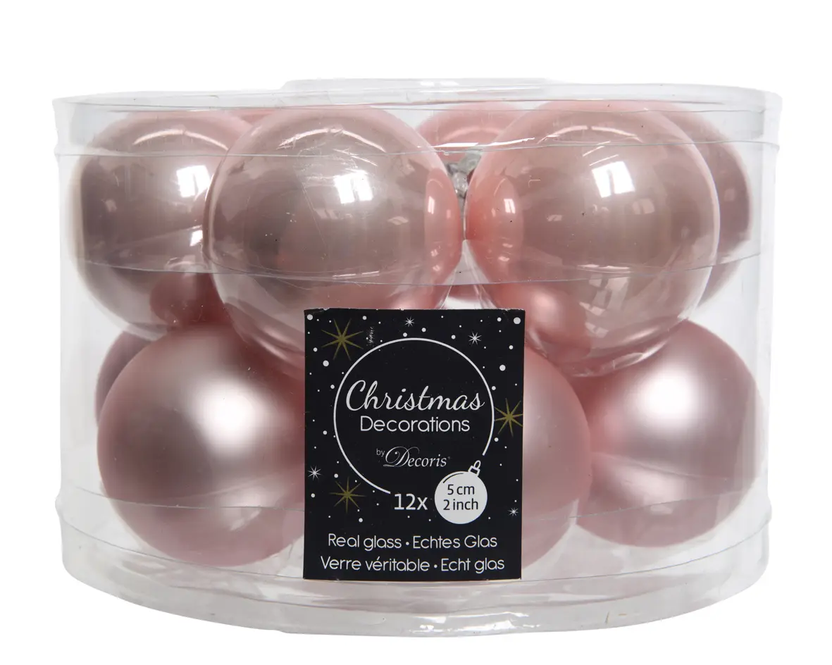 De 12 kerstballen bestaan uit twee soorten, 6x enamel en 6x mat. Ze hebben een prachtige poederroze kleur en zijn gemaakt van glas.