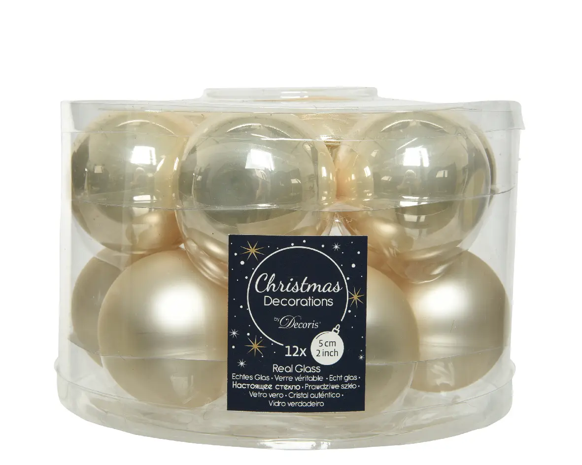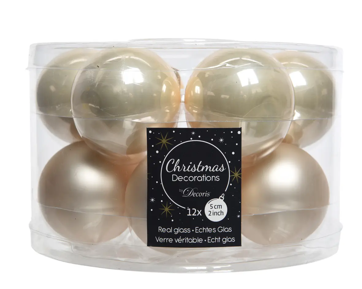 De 12 kerstballen bestaan uit twee soorten, 6x enamel en 6x mat. Ze hebben een prachtige parelkleur en zijn gemaakt van glas.