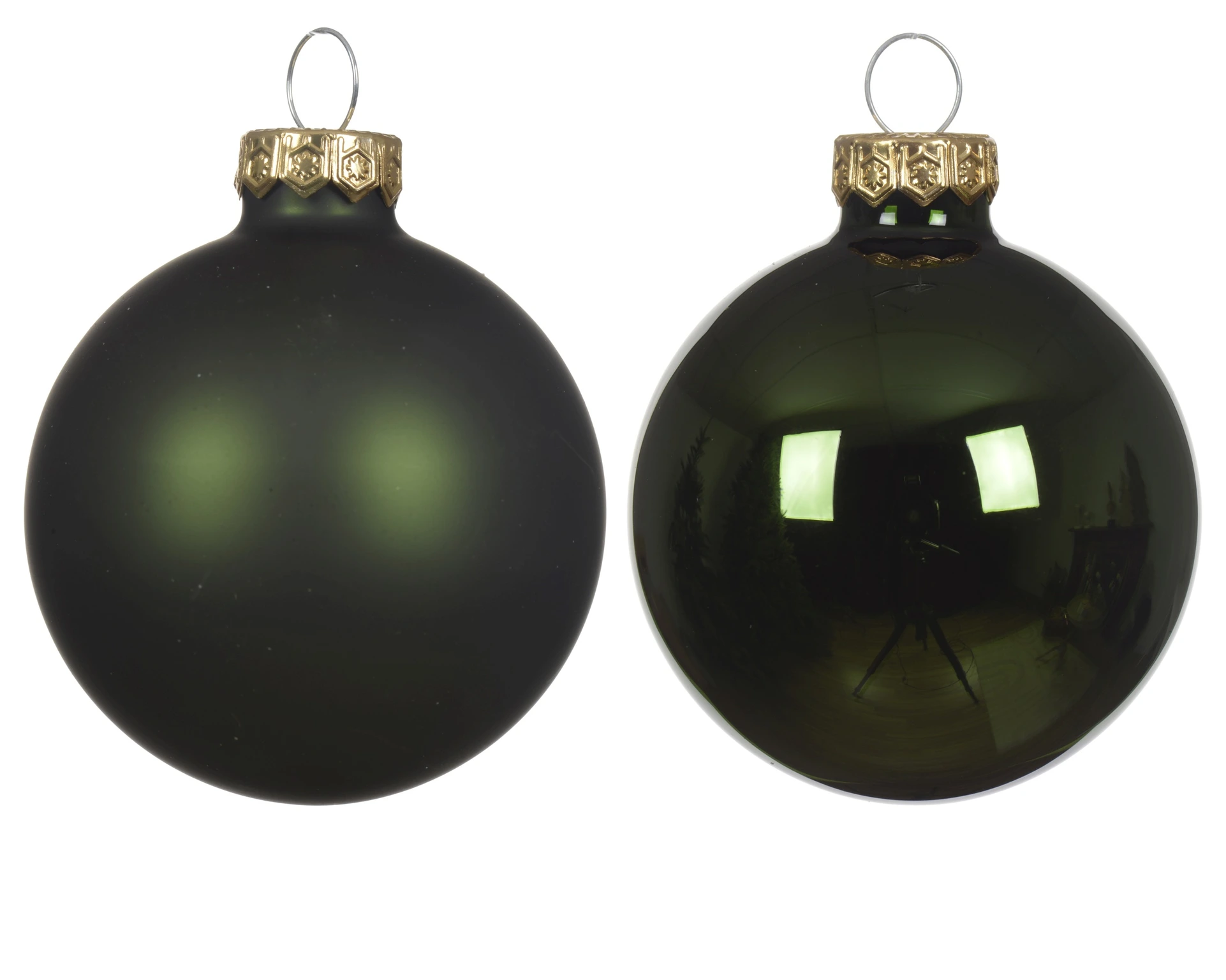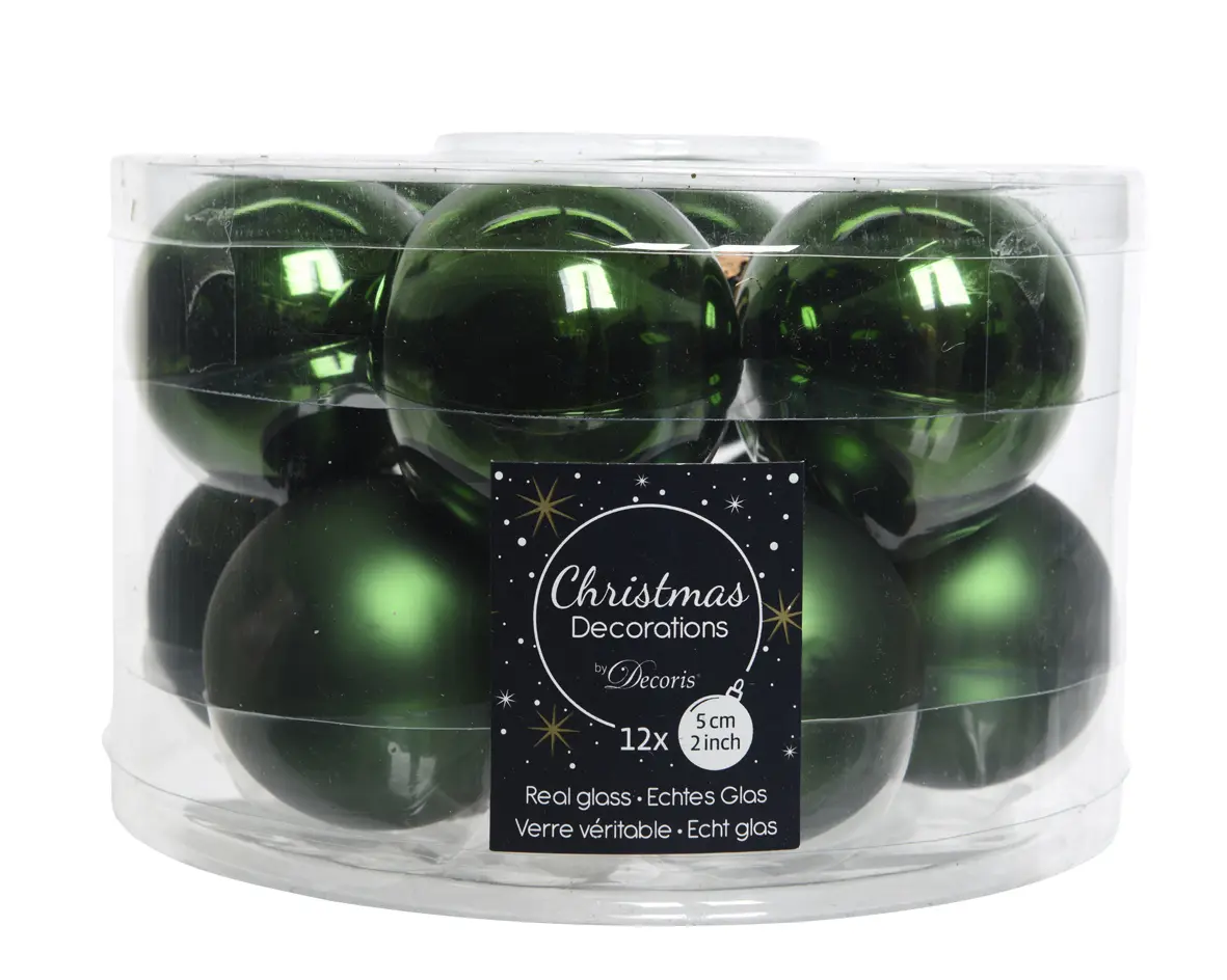 De 12 kerstballen bestaan uit twee soorten, 6x shiny en 6x mat. Ze hebben een prachtige dennengroen kleur en zijn gemaakt van glas.