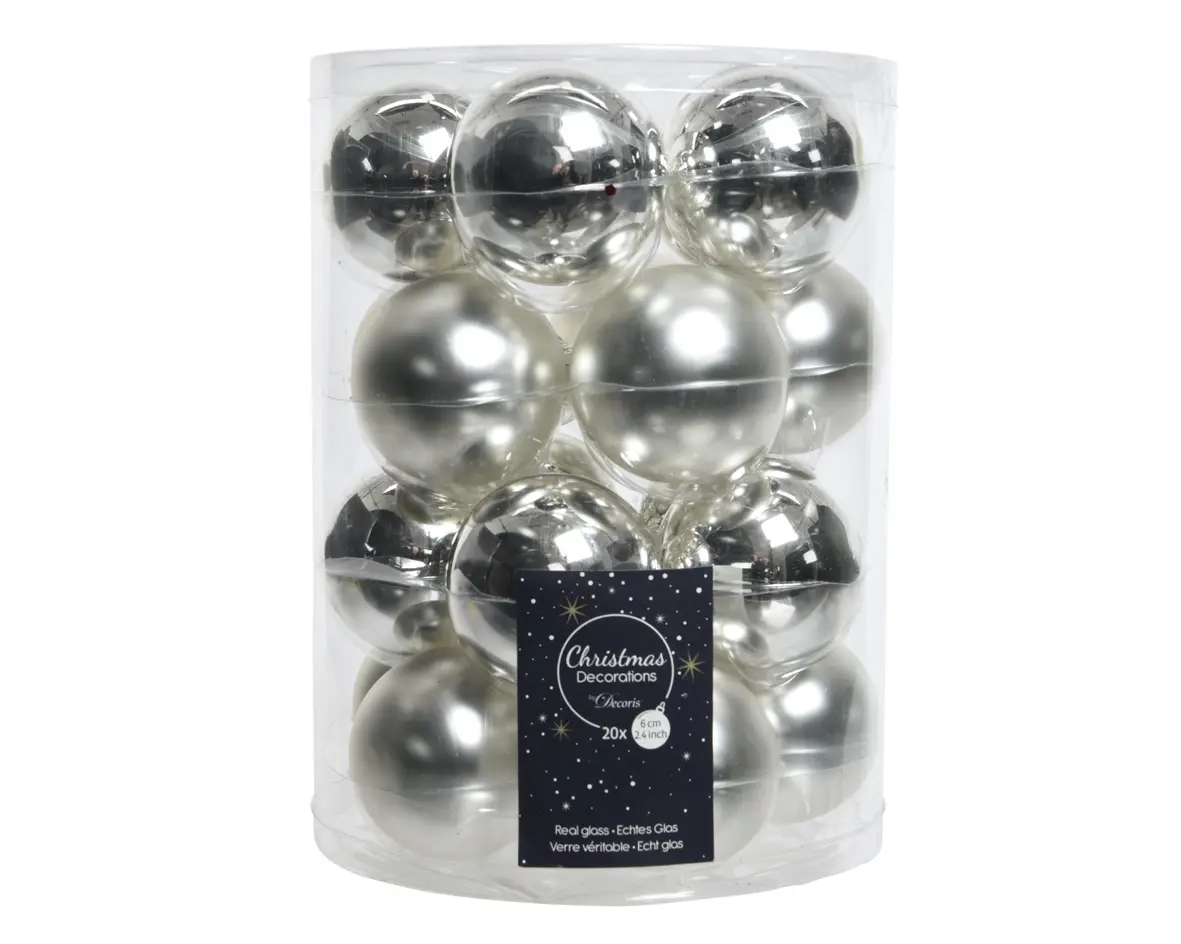 De 20 kerstballen bestaan uit twee soorten, 10x glanzend en 10x mat. Ze hebben een prachtige zilveren kleur en zijn gemaakt van glas.