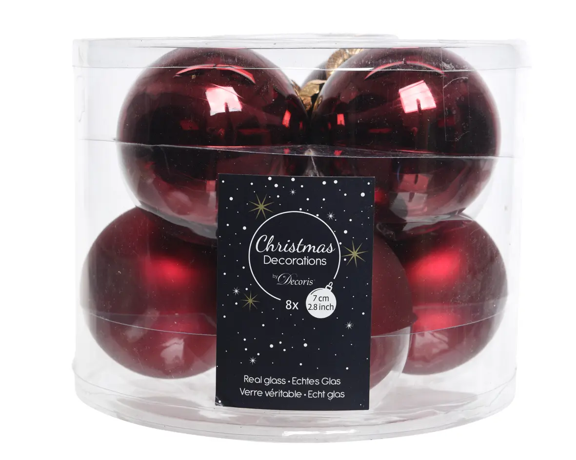 De 8 kerstballen bestaan uit twee soorten, 4x glanzend en 4x mat. Ze hebben een prachtige ossenbloed rode kleur en zijn gemaakt van glas.