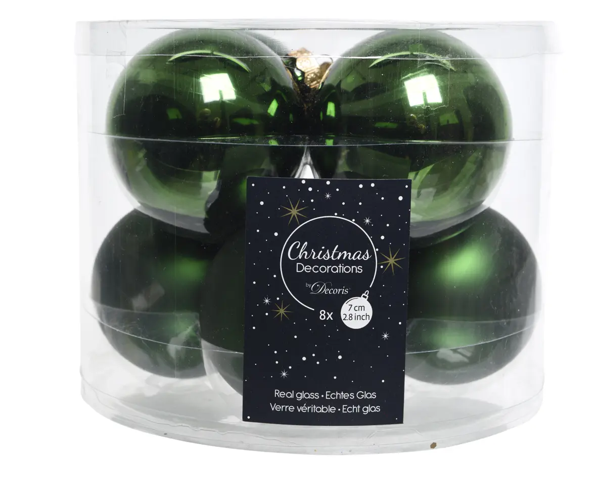 De 8 kerstballen met een diameter van 7 cm bestaan uit twee soorten: 4x glanzend en 4x mat. Ze hebben een prachtige dennengroen kleur en zijn gemaakt van glas.