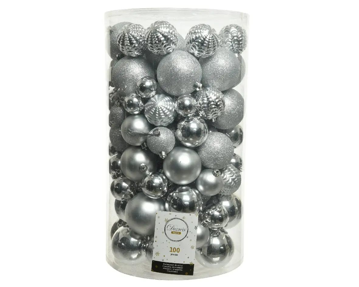 Een mix van 100 zilverkleurige kerstballen in glans, mat en glitter.