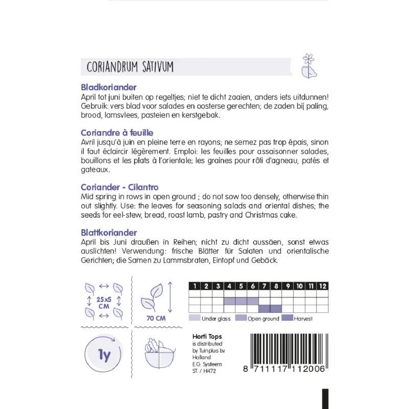 Koriander zaden kun je zaaien van april tot juni buiten op regeltjes. Niet te dicht zaaien en anders iets uitdunnen. De planten bloeien met prachtige witte schermen. Oogst de zaadschermen als ze gerijpt zijn. De plantafstand is 25 x 5 cm. Er zitten ca. 100 zaden per gram in een zakje.