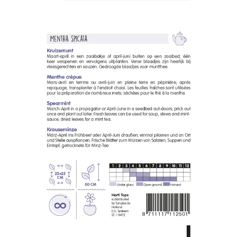 Kruizemunt zaden kun je zaaien van maart - april in een zaaibakje. Of van april - juni buiten op een zaaibed. Eén keer verspenen en dan uitplanten. De plantafstand is 25 x 25 cm. De verse blaadjes zijn heerlijk bij vleesgerechten en sauzen. Gedroogd blad is lekker voor een kopje muntthee. Er zitten ca. 11.000 zaden per gram in een zakje.