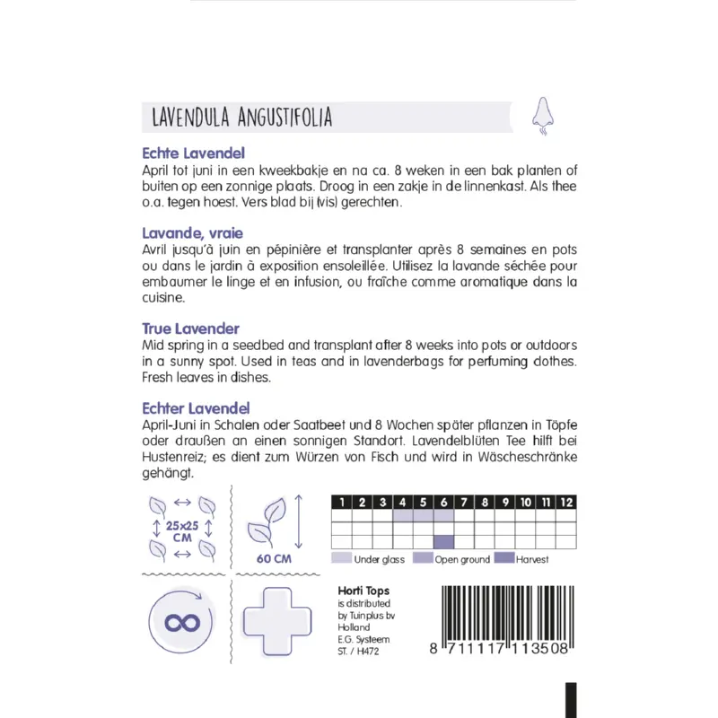 Lavendula (Lavendel) zaden kun je zaaien vanaf april tot juni en dan na ca. 8 weken in een bak of buiten uitplanten op een zonnige plaats. De plantafstand is 25 x 25 cm. Je kunt lavendel droog in een zakje in je linnenkast bewaren voor een heerlijke geur. Maar ook als thee tegen o.a. hoesten. En vers blad is lekker bij (vis) gerechten. Er zitten ca. 1000 zaden per gram in een zakje.