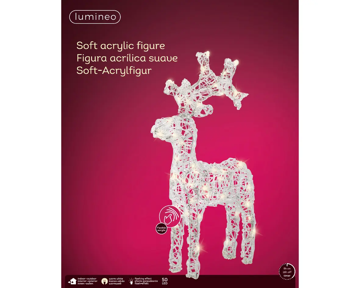 Het LED rendier heeft 50 LED lampjes en werkt via een transformator. De kleur van de LED verlichting is warm wit en de lampjes zijn 5mm groot. Er zit een timer op. Het aanloopsnoer is 5 m.