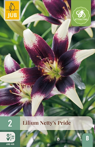 Lelie ‘Netty’s Pride’ heeft een bijzonder contrast van lichtgekleurde bloemblaadjes met een donker hart. Dit maakt haar een unieke verschijning in de tuin.