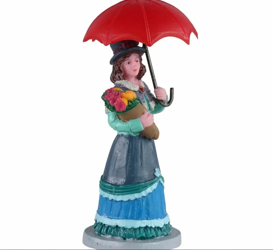 Met een knalrode paraplu is deze Lovely Lady van Lemax goed voorbereid op een regenbui of is beschermd tegen de felle zon. De bos bloemen die ze gekocht heeft is heel vrolijk.