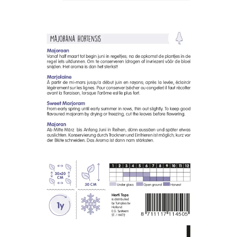 Majoraan kun je zaaien van half maart - begin juni in regeltjes. Na opkomst kun je de plantjes iets uitdunnen in de regel. Zaai op een zonnig plekje en houd de grond voldoende vochtig. Kan ook in een pot gezaaid worden. De plantafstand is 30 x 20 cm. De topjes van de stengels kun je oogsten voor de bloei. Er zitten ca. 4000 zaden per gram in een zakje.