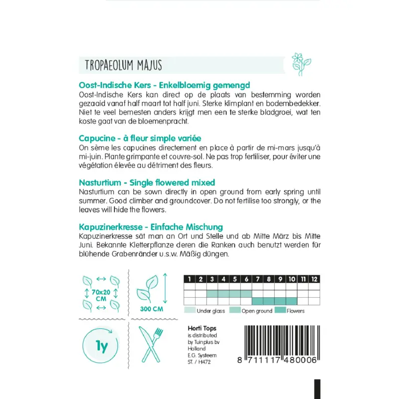 De Oost-Indische Kers zaden kun je direct buiten op de plaats van bestemming zaaien vanaf half maart tot half juni. Het is een sterke klimplant en bodembedekker. Niet te veel bemesten want anders krijgt je te veel bladgroei en minder bloemen. Plantafstand is 70 x 20 cm. Er zitten ca. 9 zaden per gram in een zakje.