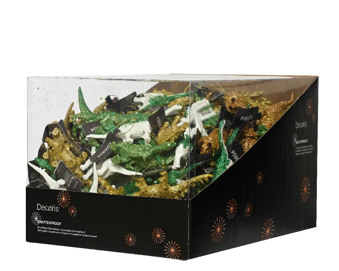Deze dino ornamenten zijn gemaakt van plastic en wachten tot ze in jouw kerstboom komen te hangen. D.m.v. een touwtje kunnen ze opgehangen worden.