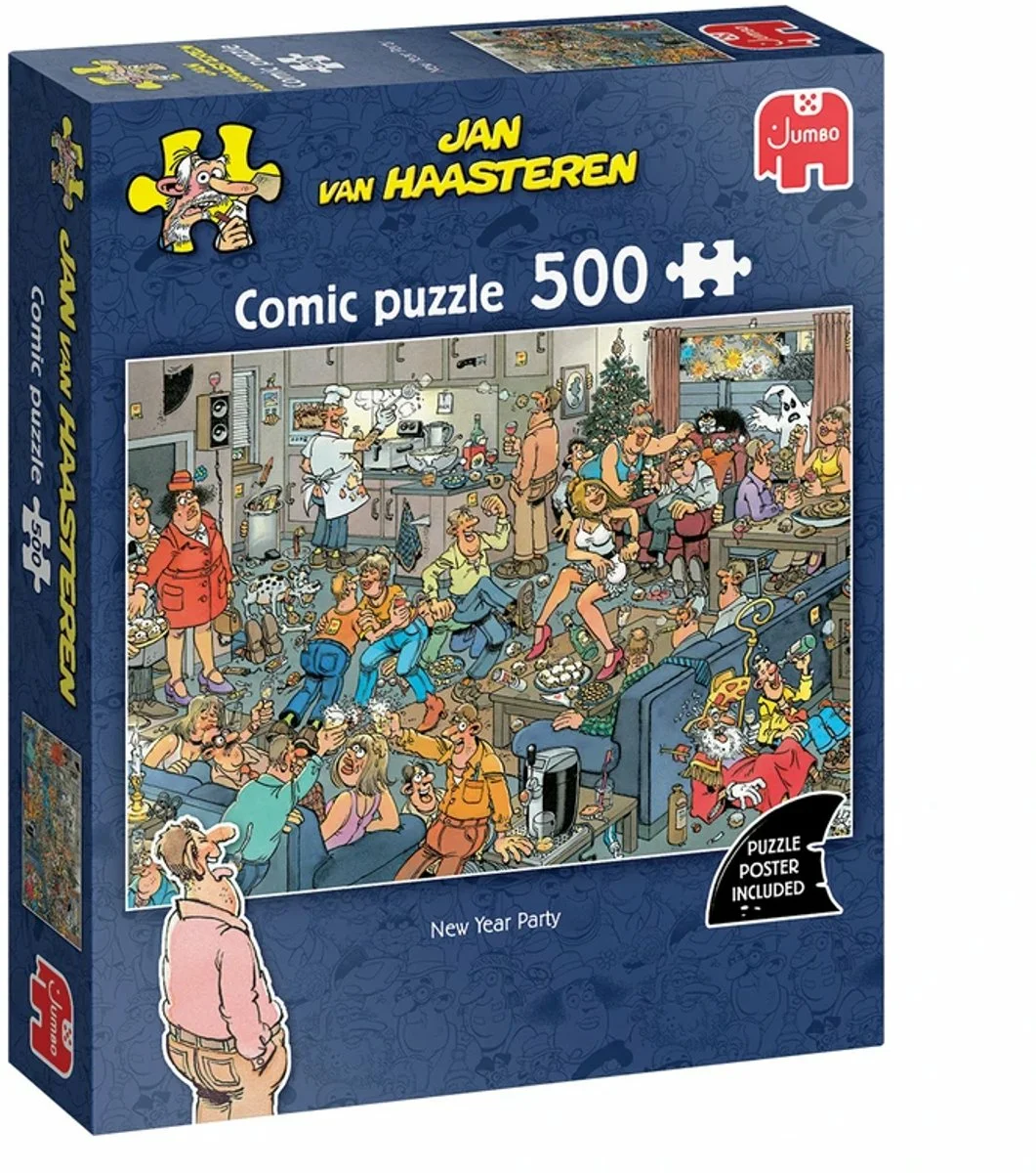 Terwijl het vuurwerk buiten losbarst, wordt er binnen vrolijk oud en nieuw gevierd. Sinterklaas en Piet hebben iets te diep in het glaasje gekeken en de oliebollen vliegen de pan uit. Eten, drinken en dansen, wat een heerlijk feest. De schoonmoeder vindt het niet zo leuk, maar de schoonvader echt wel. Ook de haaienvin en het slakje zijn weer aanwezig. Geniet met oud en nieuw van deze super leuke chaotische puzzel van Jan van Haasteren.