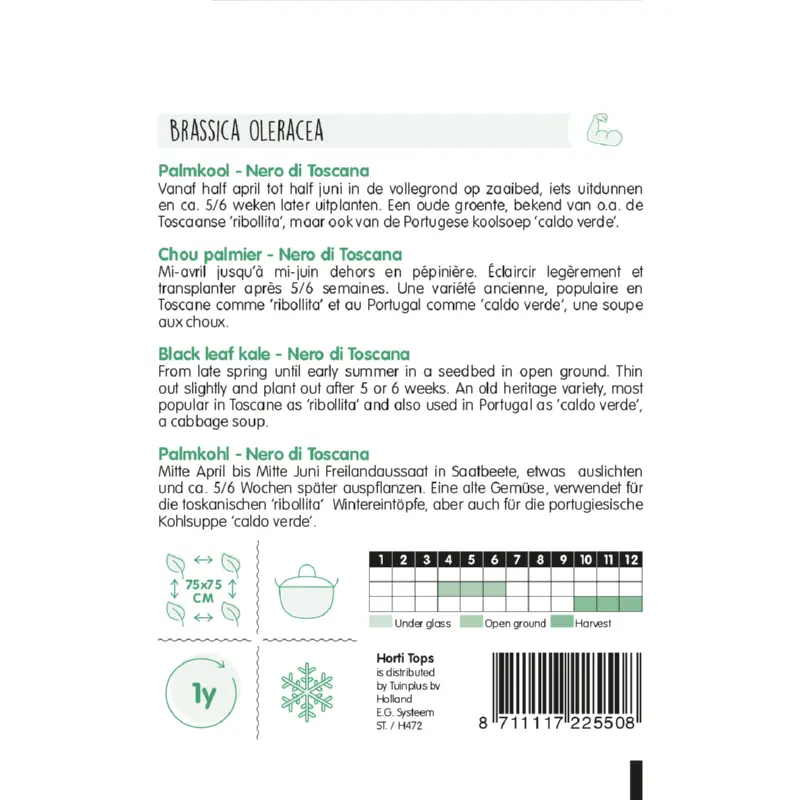 HT Palmkool 'Nero di Toscane' zaden zaai je vanaf half april tot half juni in de vollegrond op een zaaibed. Daarna eventueel uitdunnen en ongeveer 5/6 weken later uitplanten. Plantafstand is 75 x 75 cmEr zitten ca. 300 zaden per gram in een zakje. Het blad is smal en sierlijk. Een oude groente, bekend van o.a. de Toscaanse 'ribollita' (soep), maar ook van de Portugese koolsoep 'caldo verde'.