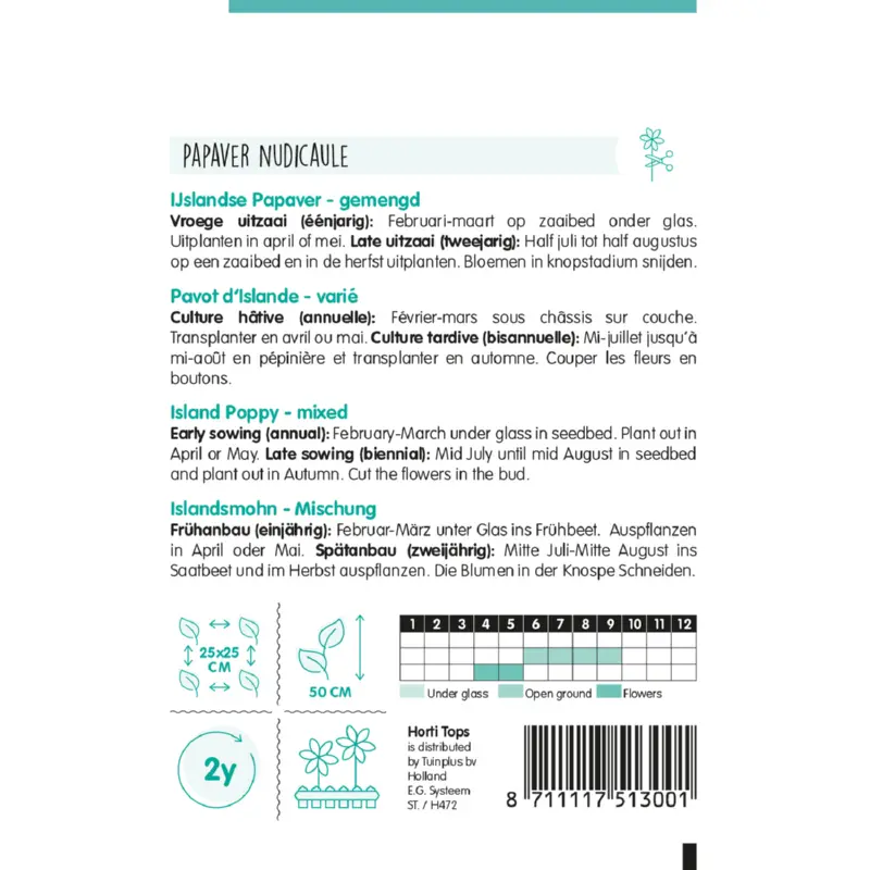 De IJslandse papaver zaden kun je voor een vroege uitzaai (éénjarig) van februari - maart op een zaaibed onder glas zaaien. Uitplanten in april of mei. Een late uitzaai (tweejarig) direct buiten zaaien vanaf half juli tot half augustus op een zaaibed en in de herfst uitplanten. Plantafstand is 25 x 25 cm. Een mooie bloem voor in een grote groep. De bloemen hebben prachtige kleuren. Er zitten ca. 8000 zaden per gram in een zakje.