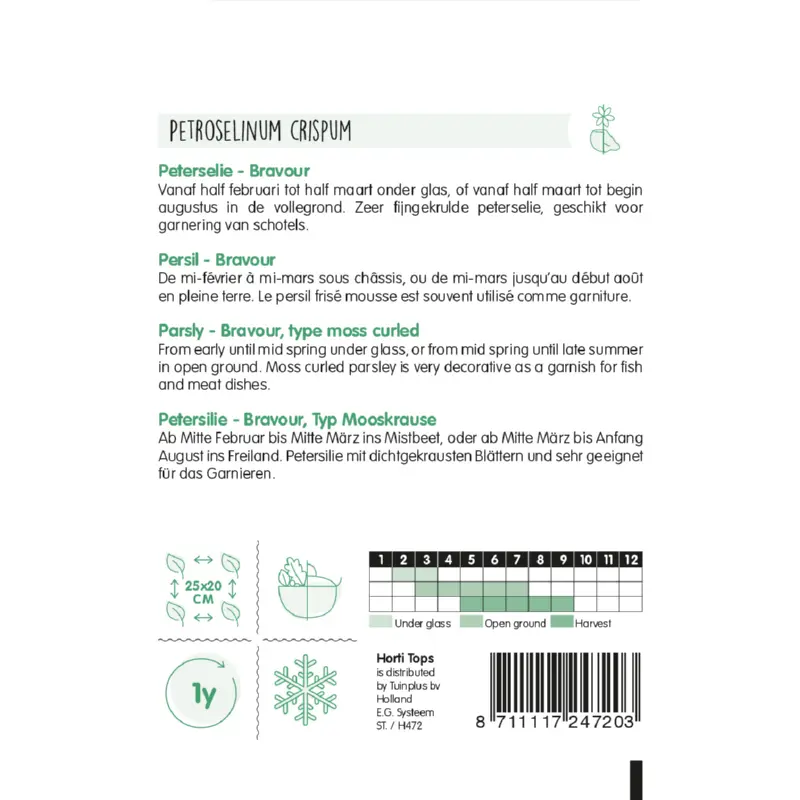 Fijn gekrulde Peterselie 'Bravour' is zeer geschikt voor garnering van diverse schotels en past bij allerlei gerechten.