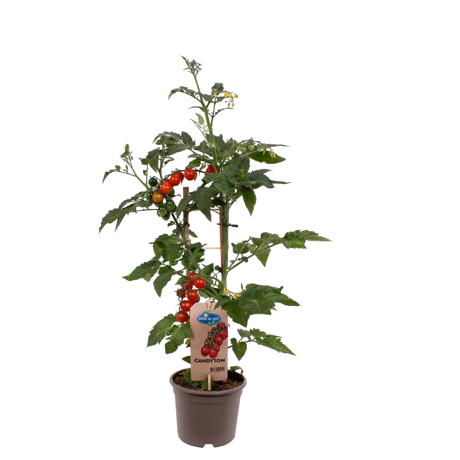 Pick-&-Joy® Candytom - Rood is een cherrytomatenplant waar smakelijke, rode tomaatjes aan groeien. Zo oogst je tomaatjes uit eigen tuin.