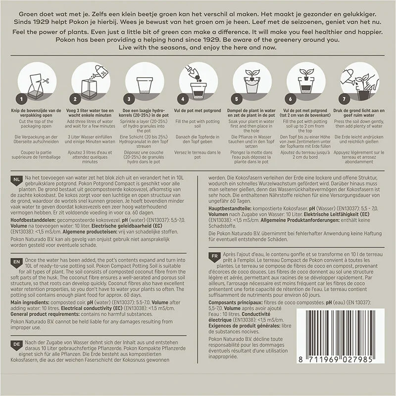 Pokon Kokos Potgrond Compact bestaat uit samengeperste kokosvezels die na toevoeging van water uitzetten tot een luchtige potgrond. De structuur houdt water goed vast en zorgt tegelijkertijd voor voldoende lucht bij de wortels.