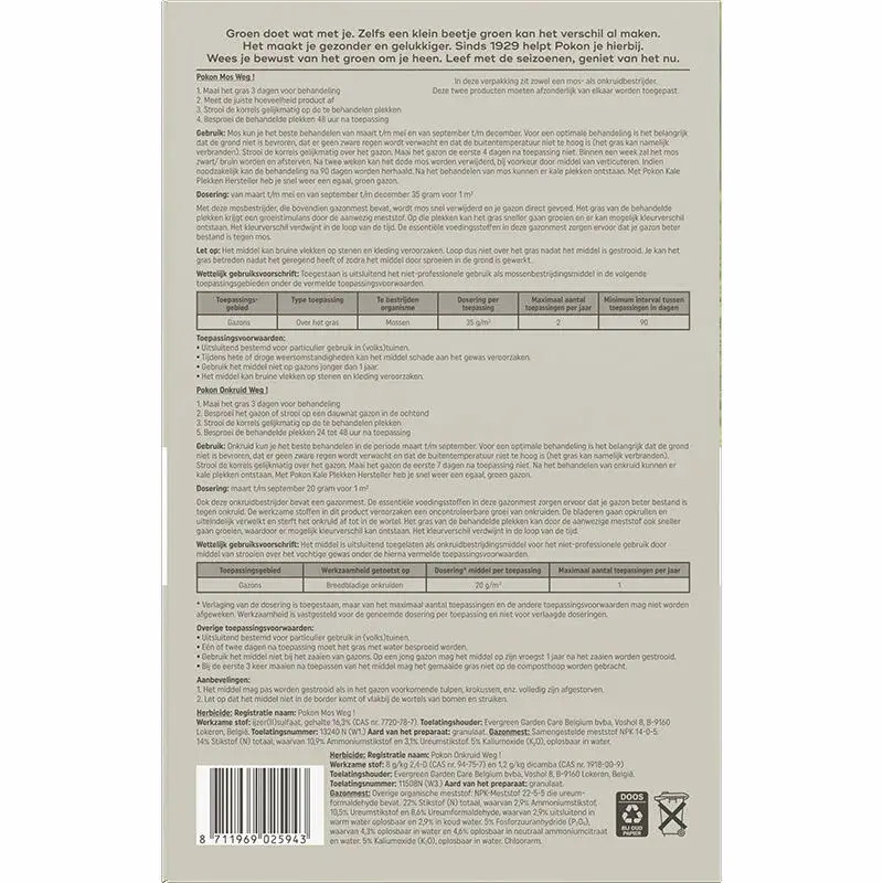 Pokon Mos en Onkruid Weg helpt bij het verwijderen van mos en onkruid uit het gazon, zodat gras weer ruimte krijgt om zich te ontwikkelen. Het product draagt bij aan een gelijkmatigere grasmat en vormt een goede basis voor verder gazononderhoud. Geschikt voor toepassing op middelgrote gazons.
