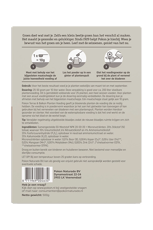 Pokon Terras & Balkon Planten Wateroplosbare Voeding wordt opgelost in water en toegediend tijdens het water geven. De voeding ondersteunt de groei en bloei van planten in potten en bakken.