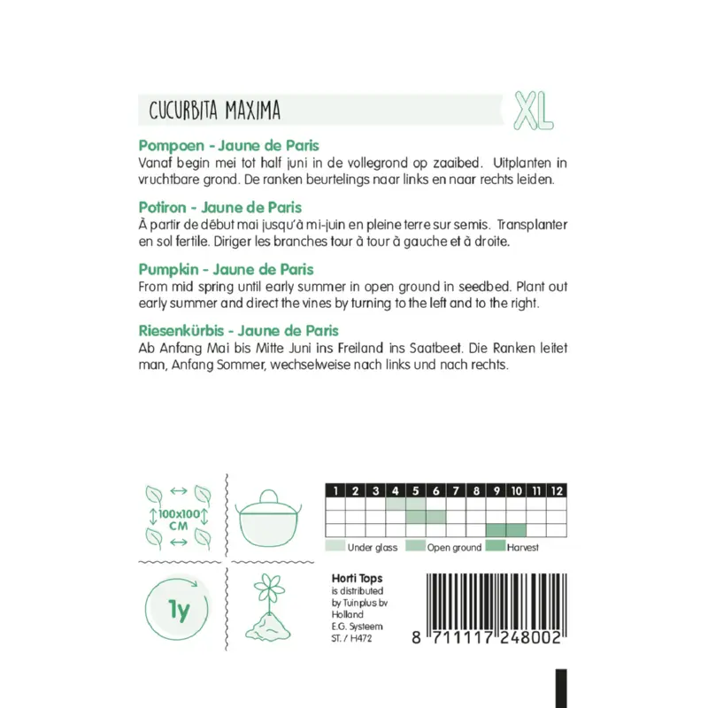 Pompoen 'Jaune de Paris' zaden zaai je vanaf april - mei in potten onder glas. Of vanaf begin mei tot half juni in de vollegrond op een zaaibed. Daarna uitplanten in vruchtbare grond. Zorg voor voldoende water. Plantafstand is 100 x 100 cm. Er zitten ca. 4 graden per gram in een zakje. De ranken laat je beurtelings naar links en naar rechts leiden. Een pompoen kan 25 kg of zelfs meer wegen.