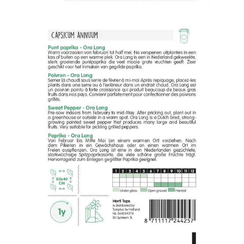 HT Puntpaprika 'Ora Long' zaden zaai je warm voor van februari tot half mei. Na het verspenen uitplanten in een kas of buiten op een warme plek. Plantafstand is 80 x 40 cm. 'Ora Long' is een in Nederland ontwikkelde, sterk groeiende puntpaprika die ook geschikt is voor grillen en inmaken.