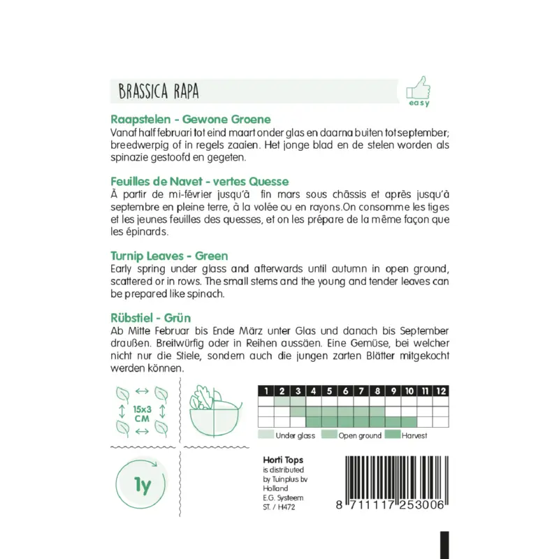 HT Raapstelen zaai je vanaf half februari tot eind mei onder glas. Daarna zaai je buiten tot september breedwerpig of in regels. Houd de grond voldoende vochtig. Plantafstand is 15 x 3 cm. Er zitten ca. 500 zaden per gram in een zakje. Het jonge blad oogst je als ze circa 15 cm lang zijn.